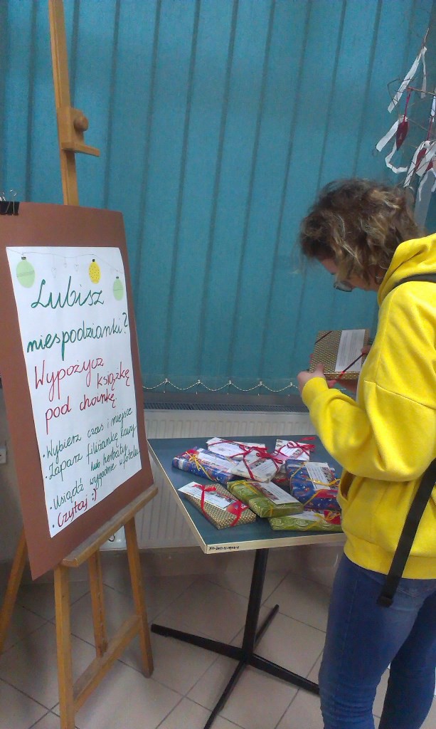 W bibliotece szkolnej, na kilka dni przed Świętami, czekały na czytelników niespodzianki. Książki nieznane z tytułu, zapakowane w formie gwiazdkowych prezentów, można było wybrać jedynie na podstawie zagadkowego opisu. Do każdej dołączono zakładkę o treści: