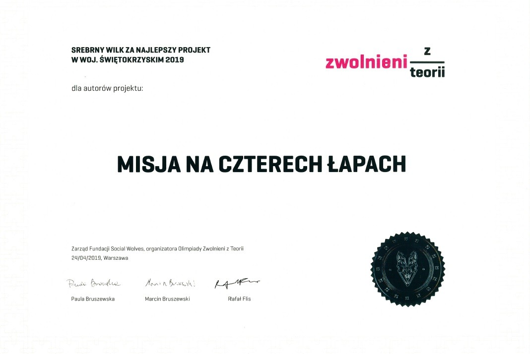 Z przyjemnością informujemy, że uczennice naszego liceum Dominika Nathali i Patrycja Malicka na gali olimpiady Zwolnieni z Teorii otrzymały nagrodę Srebrnego Wilka za najlepszy projekt w województwie świętokrzyskim "Misja na czterech łapach".