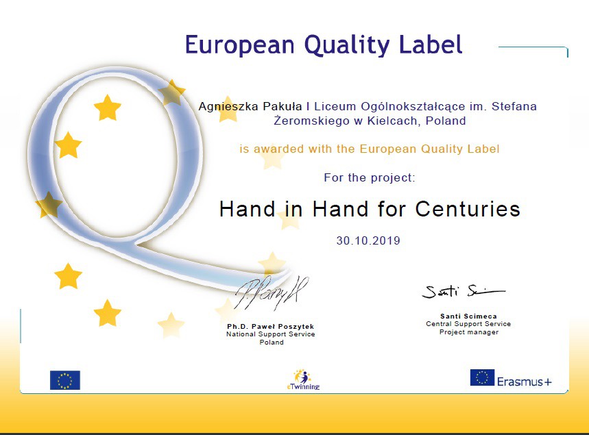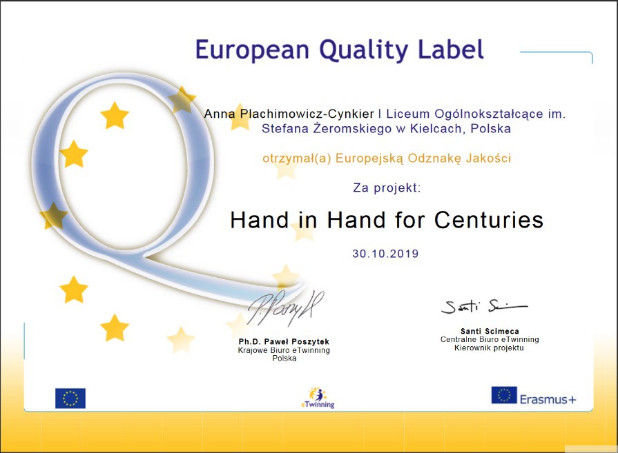 Nasza szkoła w uznaniu za wspaniałą pracę w projekcie eTwinning Hand in Hand for Centries otrzymała Europejską Odznaką Jakości (European Quality Label). Oznacza to, że praca naszych uczniów i praca I LO została oceniona jako reprezentująca najwyższy europejski poziom. Duma nas rozpiera.