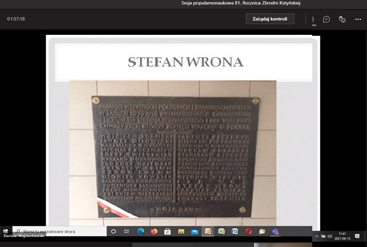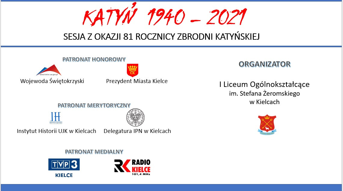 13 kwietnia 2021 r. w całym kraju obchodzony był Dzień Pamięci Ofiar Zbrodni Katyńskiej ustanowiony Uchwałą Sejmu Rzeczypospolitej Polskiej z dnia 14 listopada 2007 roku. W ramach wydarzeń towarzyszących, zorganizowana została sesja popularnonaukowa poświęcona tematyce Zbrodni Katyńskiej. W sesji przeprowadzonej on-line obok uczniów klasy 1A, 2Dg i 2Gg uczestniczyła młodzież VI Liceum Ogólnokształcącego im. Juliusza Słowackiego w Kielcach oraz VII Liceum Ogólnokształcącego im. Józefa Piłsudskiego w Kielcach. Dzięki współpracy z Wydziałem Humanistycznym Uniwersytetem Jana Kochanowskiego w Kielcach oraz Instytutem Pamięci Narodowej Delegaturą w Kielcach, które objęły patronat merytoryczny nad przedsięwzięciem, mieliśmy możliwość wysłuchania bardzo interesujących referatów.