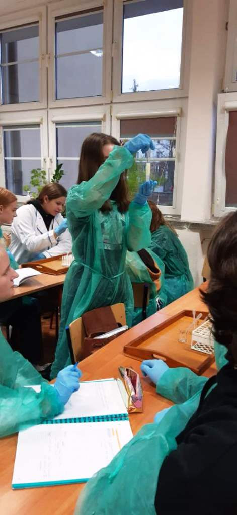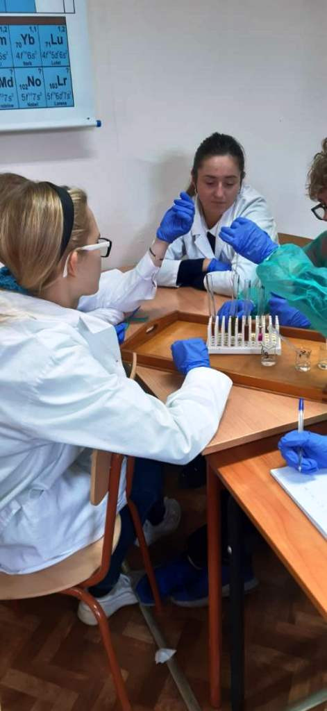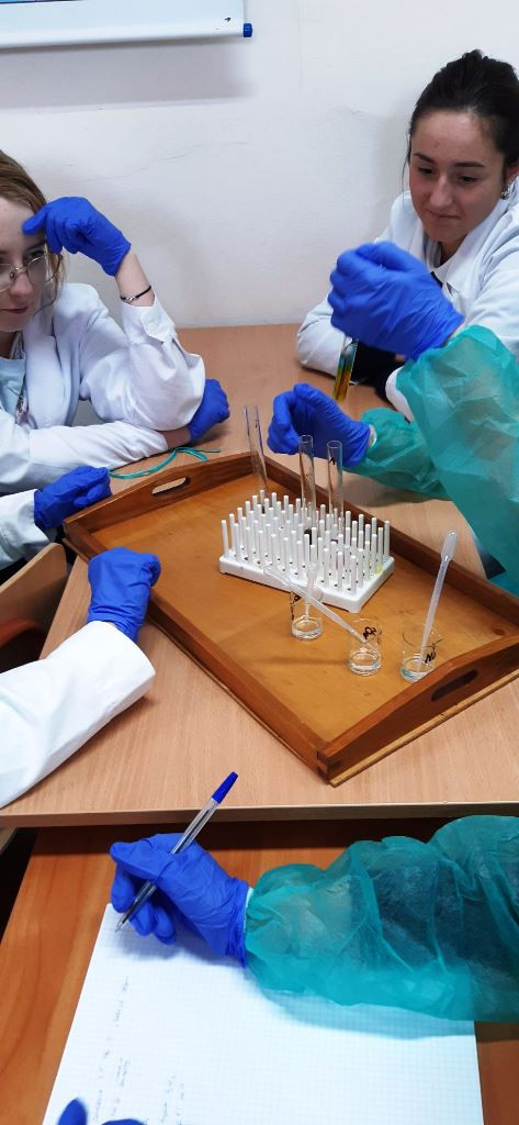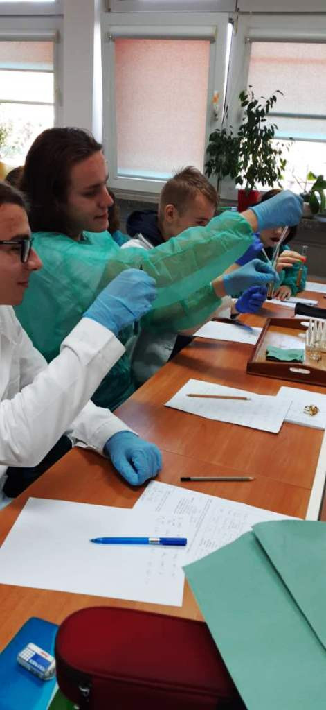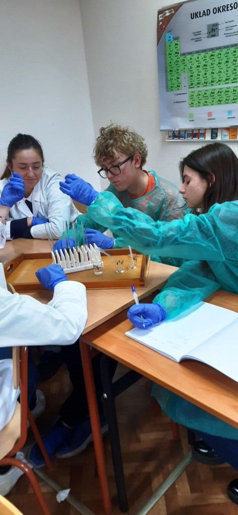 Następnie uczestnicy zostali podzieleni na sześć zespołów laboratoryjnych i przeprowadzili eksperymenty chemiczne polegające na zbadaniu utleniających właściwości manganianu (VII) potasu w środowisku kwasowym, zasadowym i obojętnym oraz badaniu utleniających właściwości dichromianu (VI) potasu w środowisku kwasowym.