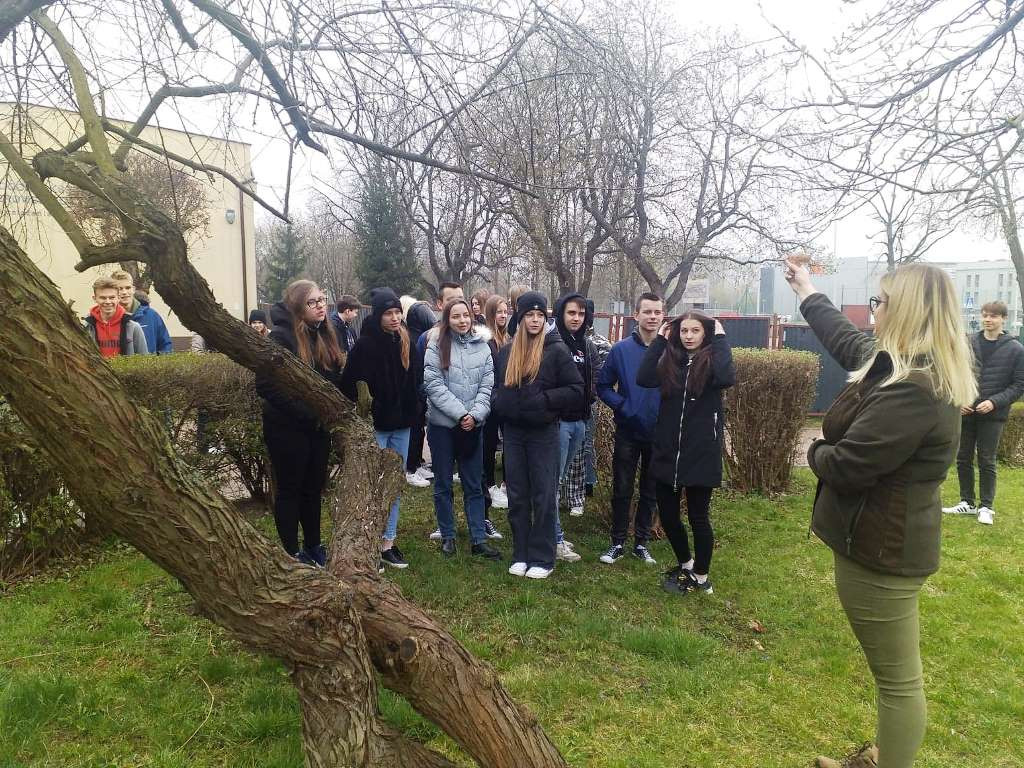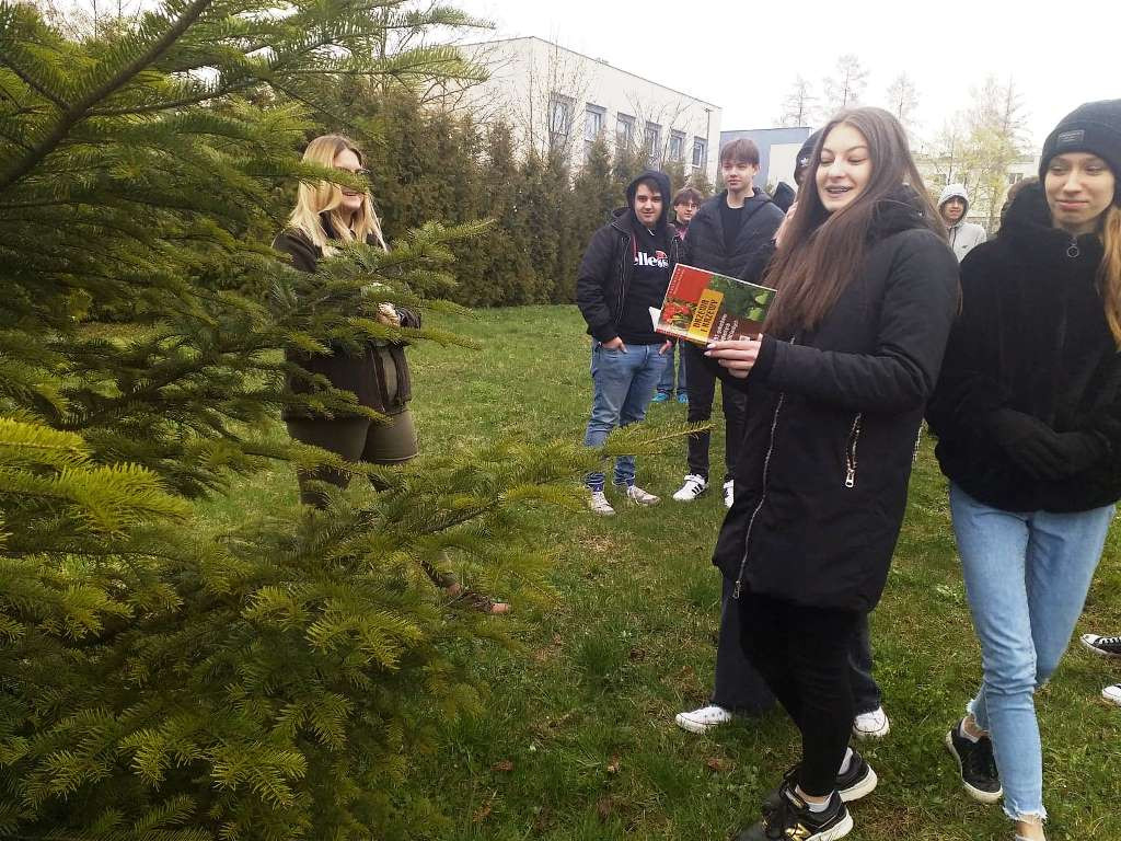 Po części teoretycznej przyszedł czas na zastosowanie zdobytej wiedzy w praktyce, dlatego udaliśmy się na teren przyszkolny. Młodzież miała za zadanie rozpoznać gatunki drzew w rejonie szkoły. Z entuzjazmem mimo brzydkiej pogody, wyposażeni w atlasy do rozpoznawania roślin oraz zdobytą wiedzą, obserwowali drzewa znajdujące się przy szkole.