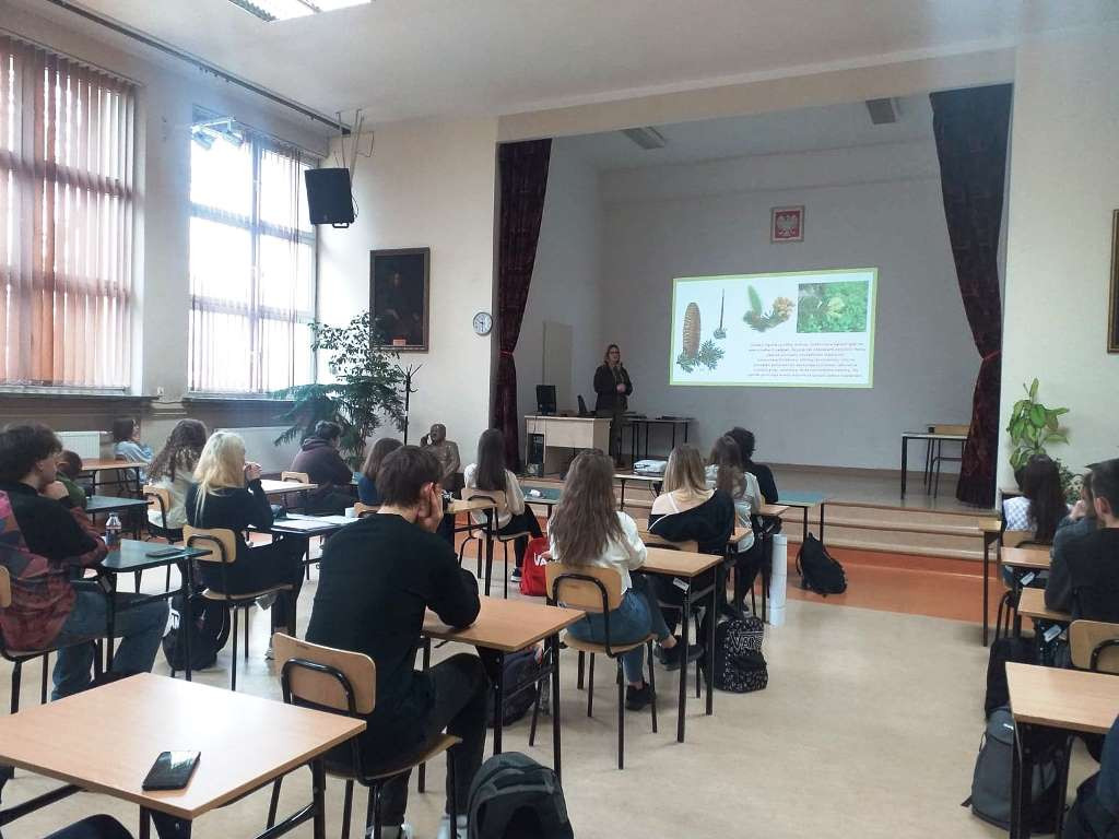 W dniu 20.04.2022r. w naszej szkole odbyły się warsztaty z udziałem pracownika z Zespołu Świętokrzyskich i Nadnidziańskich Parków Krajobrazowych w Kielcach, Panią Wiktorią Chrzanowską. Głównym celem spotkania było zapoznanie młodzieży z gatunkami drzew powszechnie występujących w naszym regionie. Pani Wiktoria bardzo szczegółowo omówiła gatunki drzew charakterystyczne dla naszego miejsca zamieszkania. Podczas prezentacji zwróciła uwagę na kształt i wygląd liści/igieł, wygląd kory, owoców, kwiatów – jako pomoc do oznaczania gatunków drzew. Podczas wykładu omówione zostały także korzyści płynące z obecności drzew w życiu człowieka.
