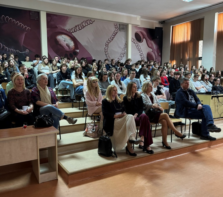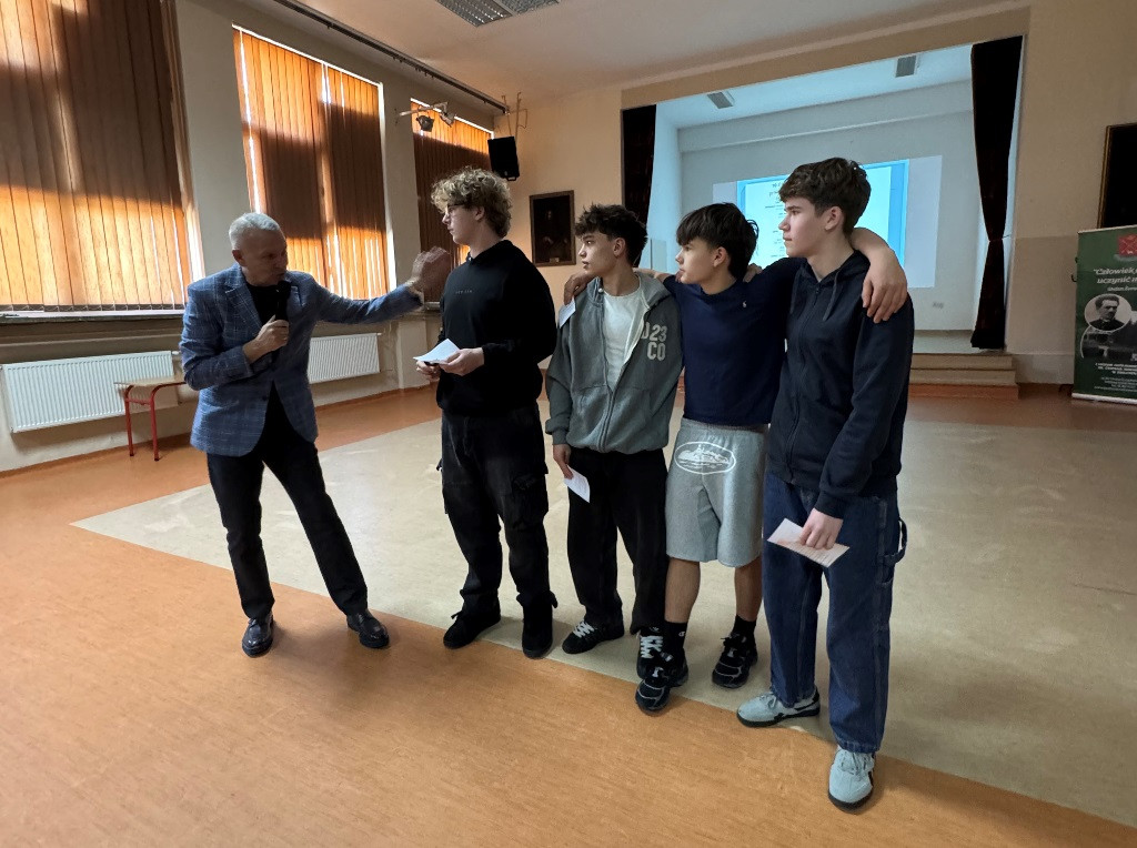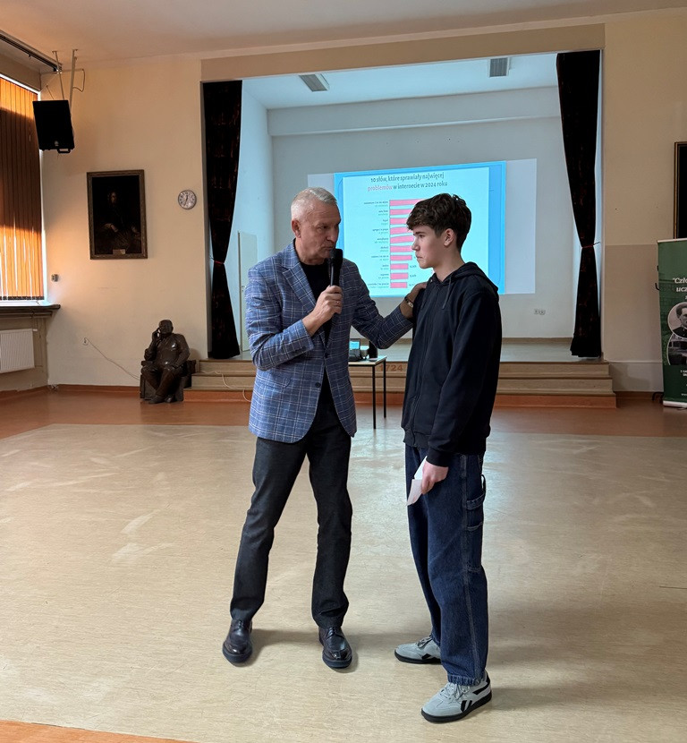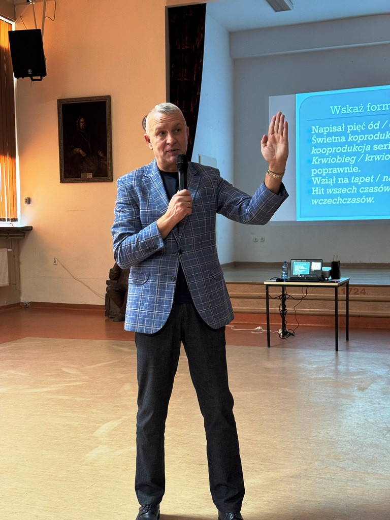 Profesor Zbróg poruszał temat powszechnie popełnianych błędów językowych, pokazując ich źródła, konsekwencje i wpływ na komunikację. Zwracał również uwagę na to, dlaczego - mimo zmian zachodzących we współczesnym języku, warto dbać o poprawność i kulturę wypowiedzi. Profesor z łatwością nawiązał kontakt z młodzieżą, angażując uczniów w quiz językowy, który spotkał się z entuzjastyczną reakcją.