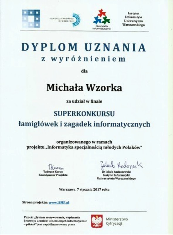 • Powiększ zdjęcie Dyplom Michała Wzorka