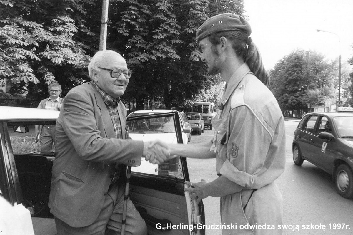 Gustaw Herling-Grudziński odwiedza swoją szkołę w 1997 roku