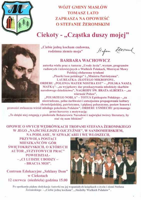 Informujemy, że 12 czerwca ( niedziela) o godzinie 1500 odbędzie się spotkanie z Panią Barbarą Wachowicz w Centrum Edukacyjnym w "Szklanym Domu" w Ciekotach.